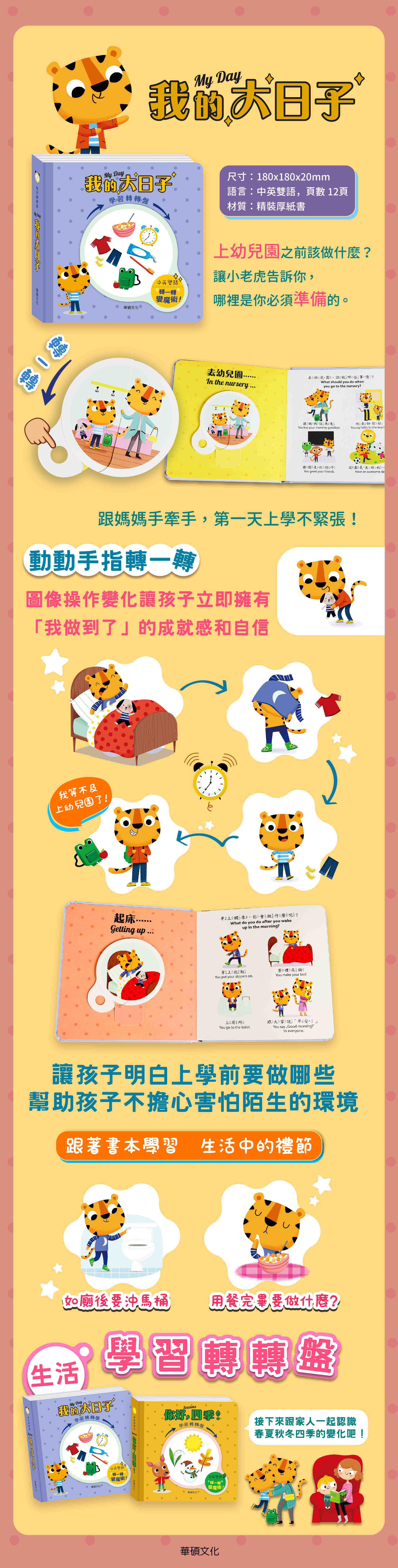 - 專為即將上幼兒園的小朋友所設計的生活學習轉盤書。
