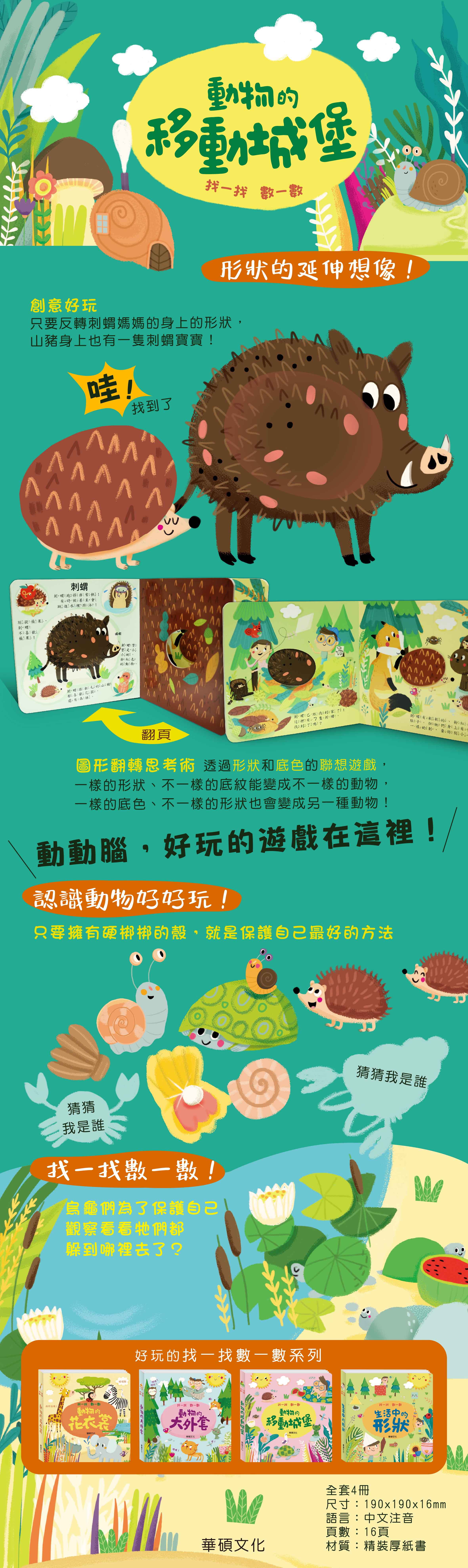 - 動物的硬殼有千百種,精美又豐富的插畫細節,滿足孩子的觀察力、探索慾。