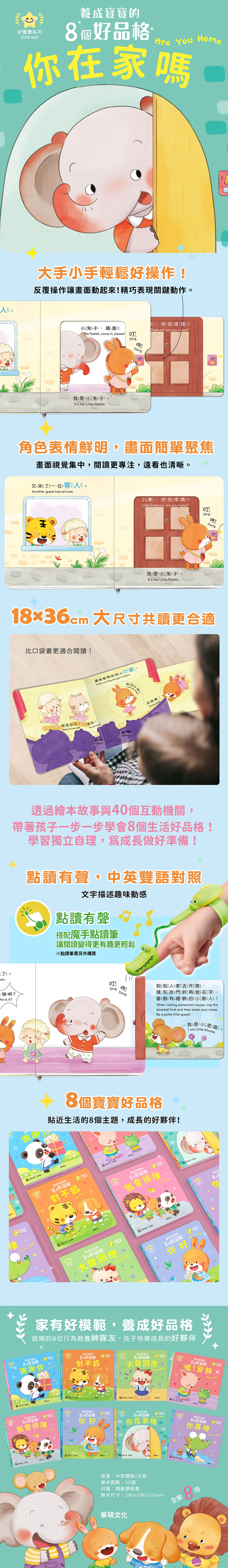 透過幽默的故事與互動操作機關,讓孩子學習當有禮貌的小客人,進入別人家前,記得按電鈴再說自己的名字,學會尊重他人的空間和隱私,養成禮貌的好習慣。