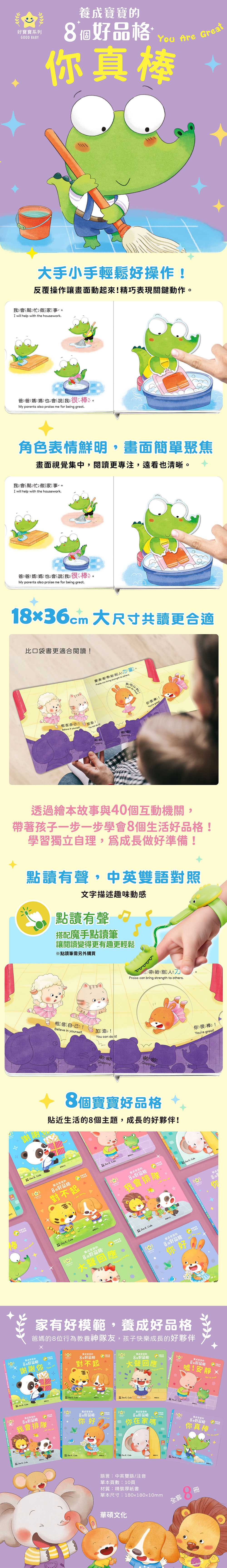 透過幽默的故事與互動操作機關,讓孩子學習欣賞他人,同時也肯定自己,學會以積極正面的態度看待自己和他人。