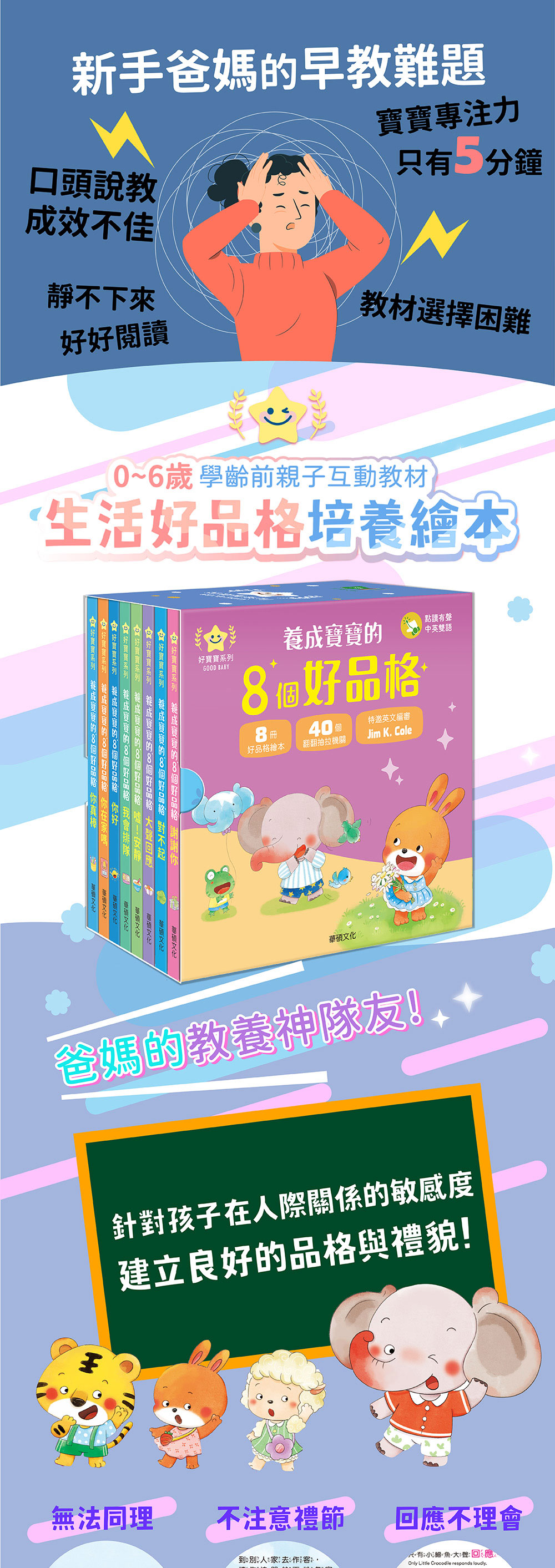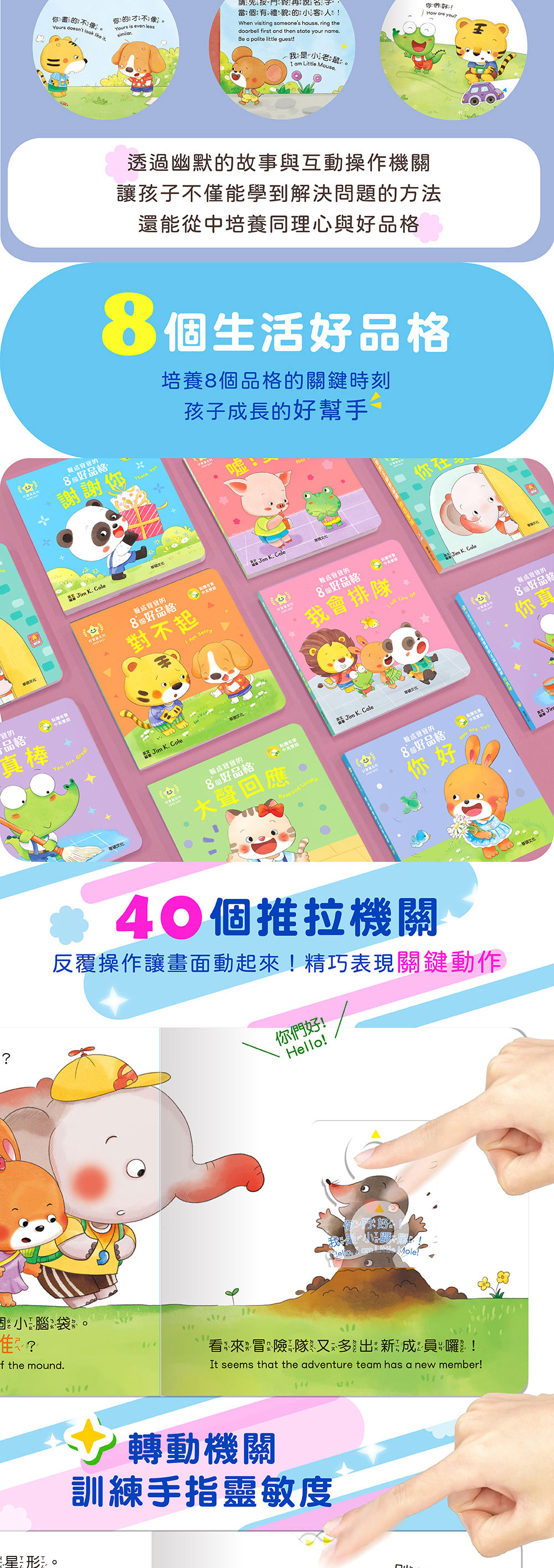 透過幽默的故事與互動操作機關,良好的品格教育,能幫助孩子養成待人處世的責任感、人際互動的友善度、正面積極的價值觀。