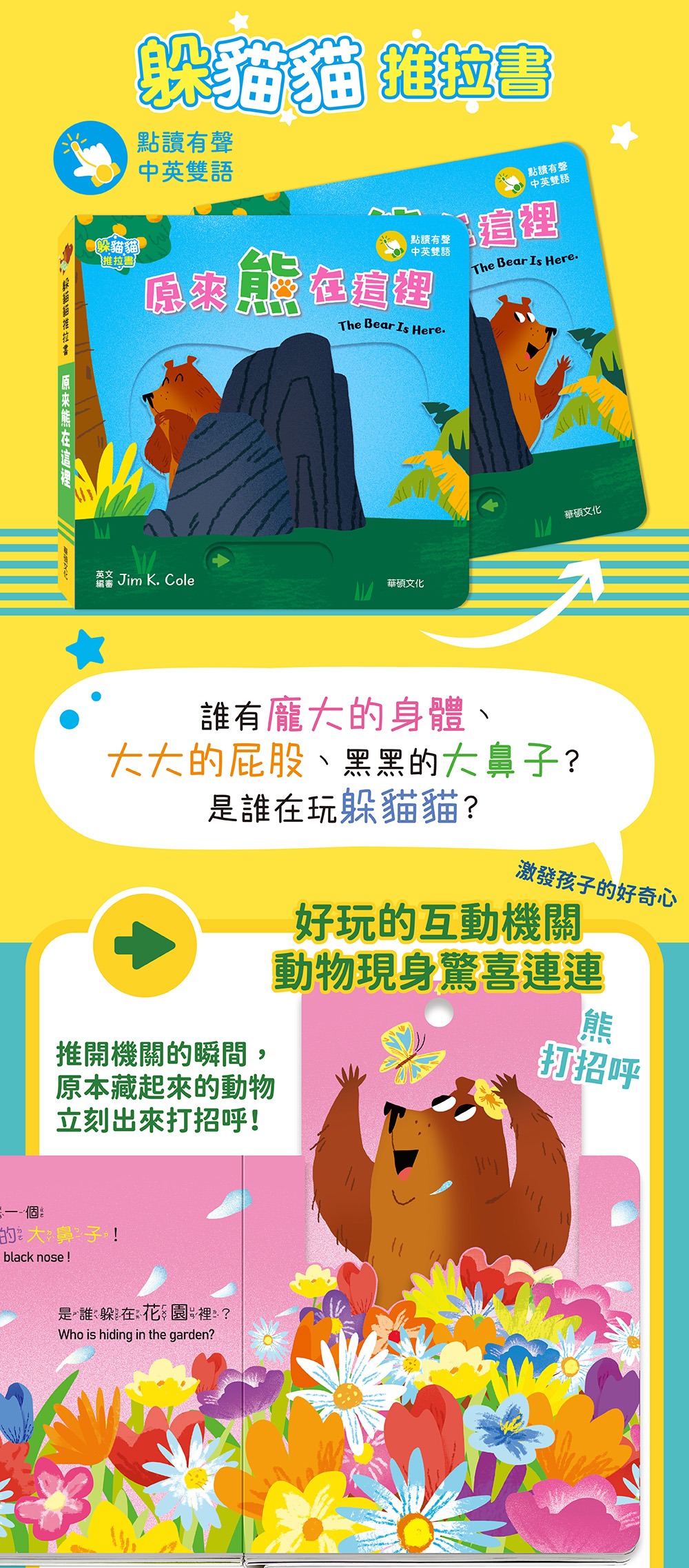 - 全書為點讀有聲中英雙語,讓孩子在玩遊戲的同時,自然而然接觸英文。