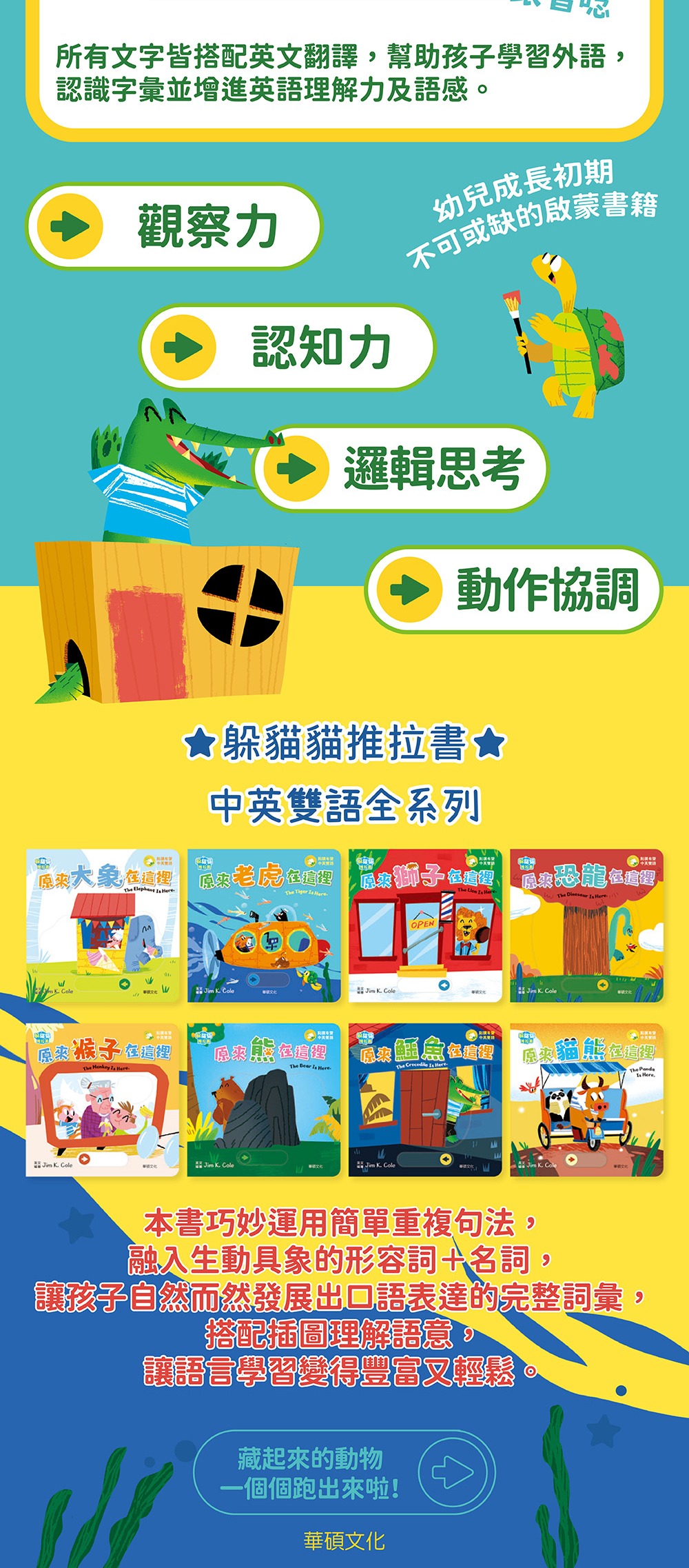 每頁都有一個簡單又引人好奇的問題,搭配生動的插圖, 引導孩子觀察畫面細節,猜猜看藏起來的是什麼動物。