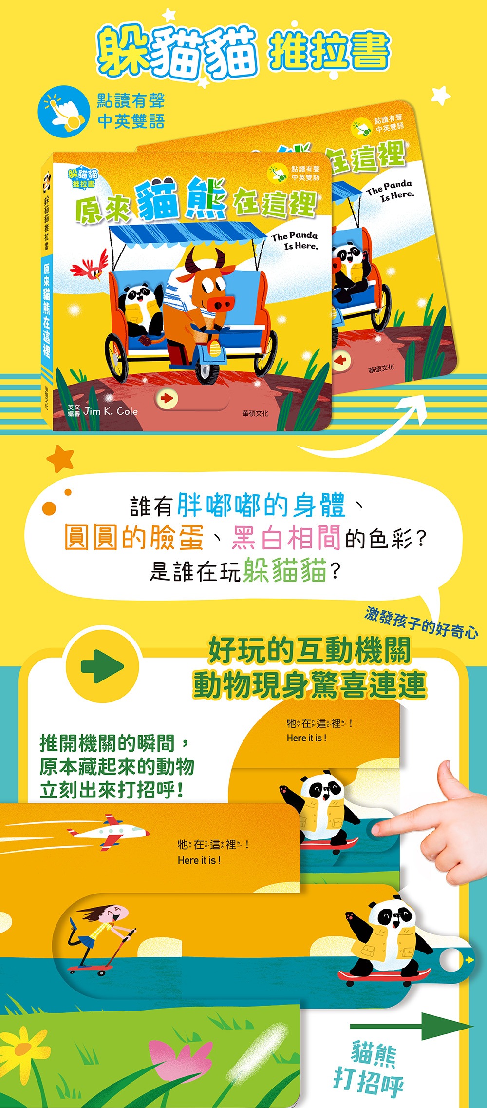 - 全書為點讀有聲中英雙語,讓孩子在玩遊戲的同時,自然而然接觸英文。
