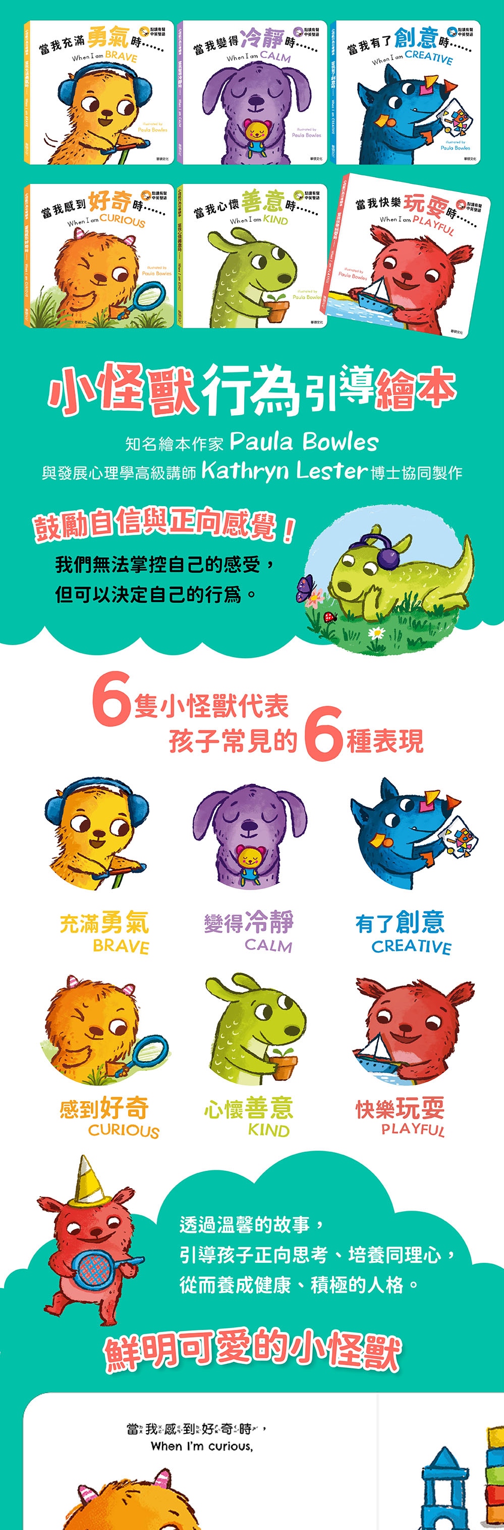 全系列共六冊,以六個小怪獸的成長故事, 分別聚焦在日常中重要的六種內在力量 ──勇氣、冷靜、創意、好奇心、善意與玩樂力。 透過貼近孩子經驗的溫馨故事,說明這些行為對自己的影響, 讓孩子學習如何面對自己的情緒、轉換想法,練習用正面態度看待每一天。