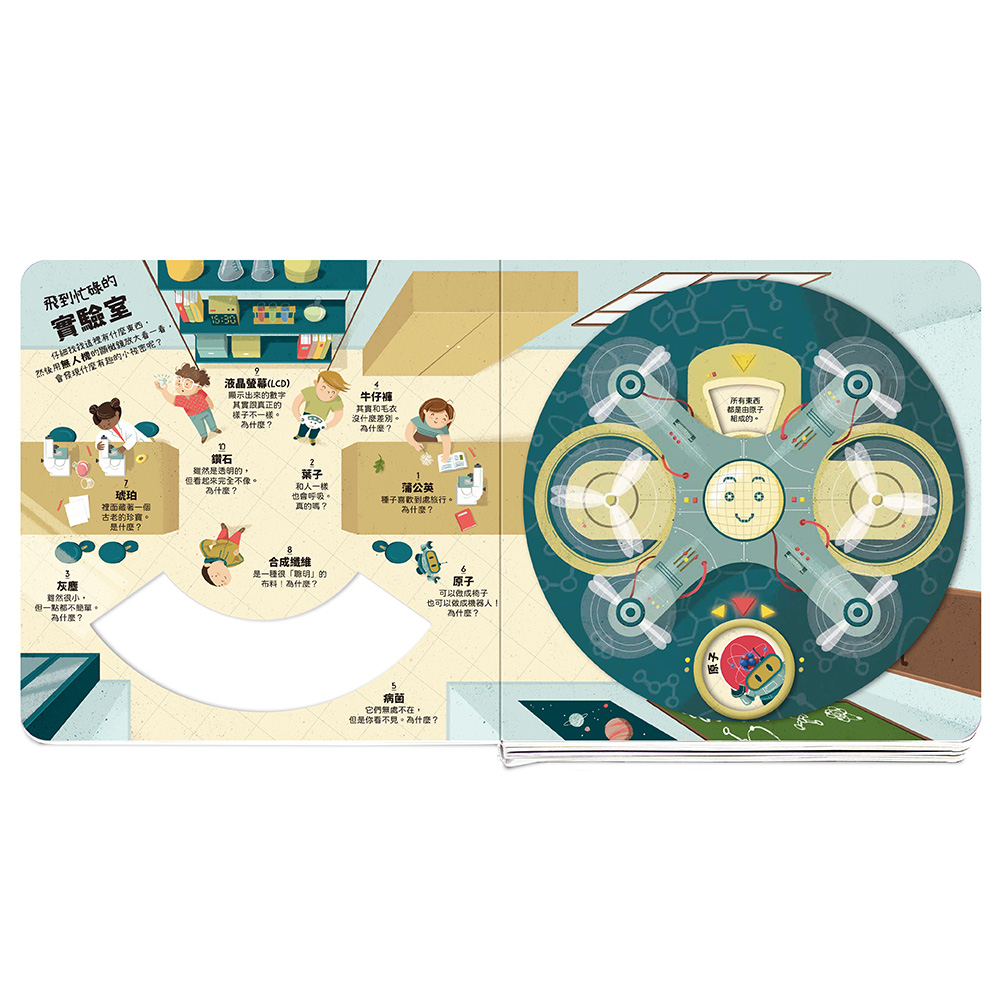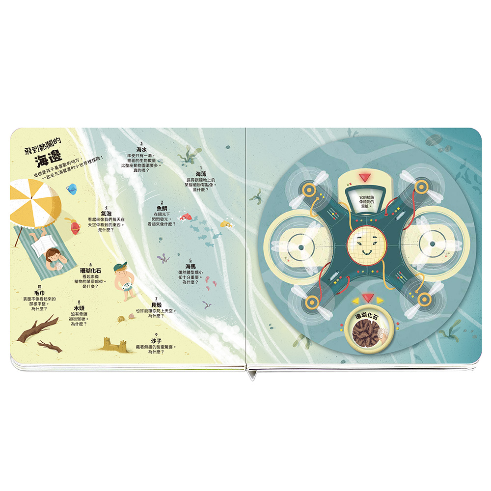 從觀察日常物品開始,訓練孩子注意細節,再透過操作旋轉機關找出對應的物品,提升手眼協調。 最後搭配淺顯有趣的知識,培養自然探索與科學認知。