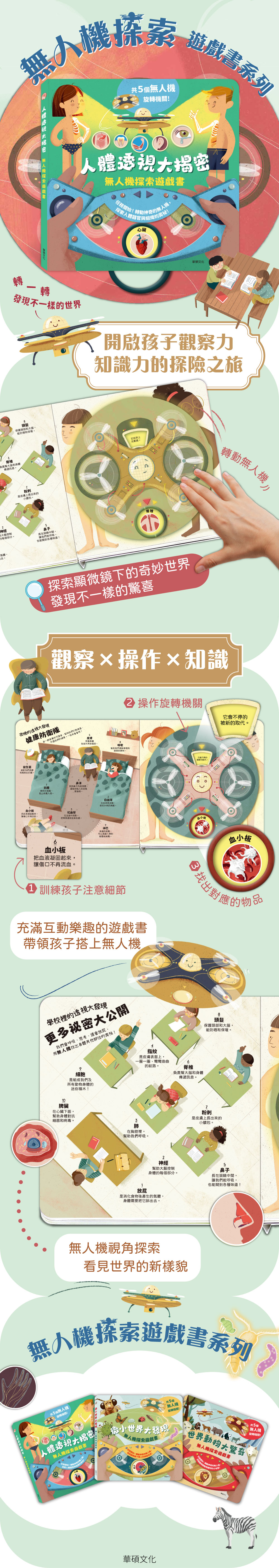 從人體構造開始,幫助孩子了解人體的組成,再透過操作旋轉機關找出對應的器官,提升手眼協調。最後搭配淺顯有趣的知識,培養科學探索與自我認知。