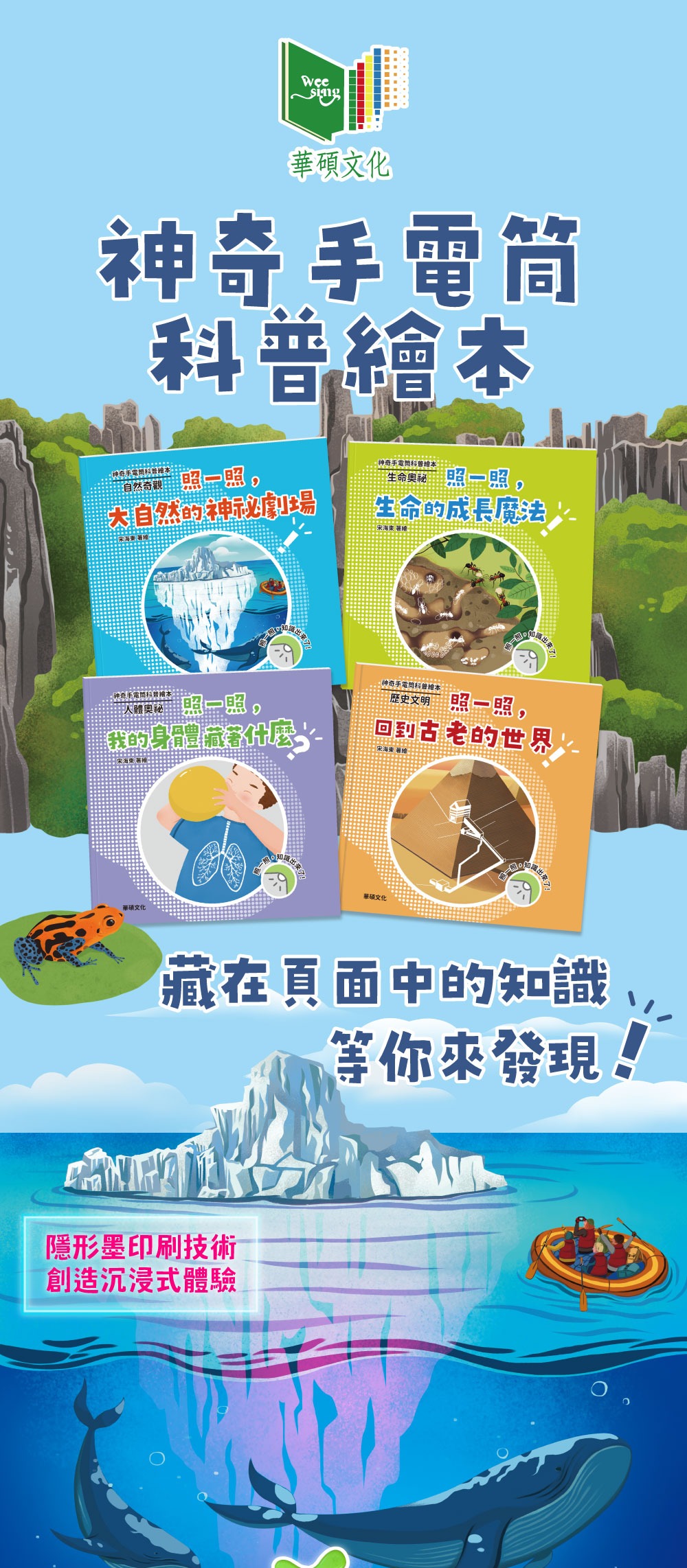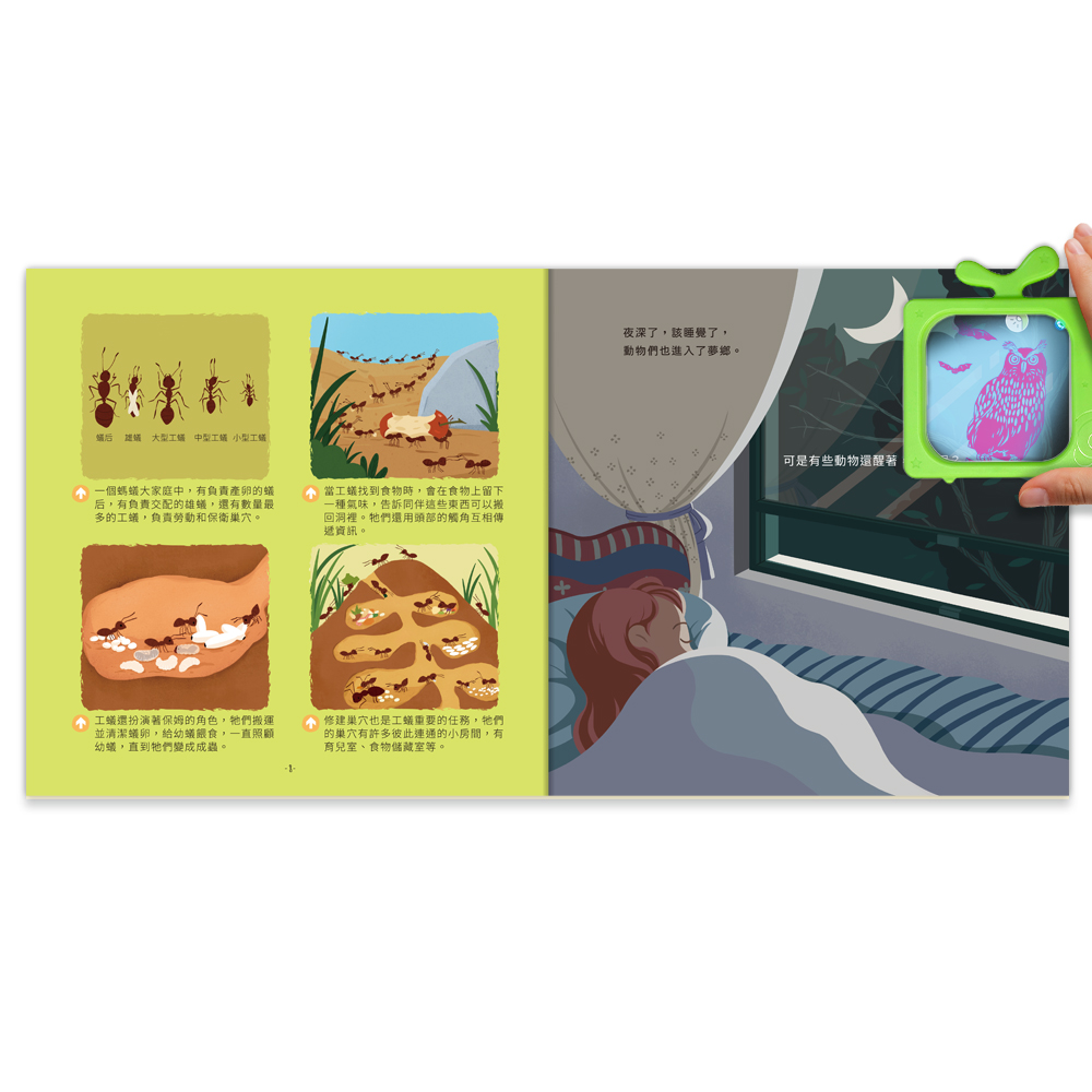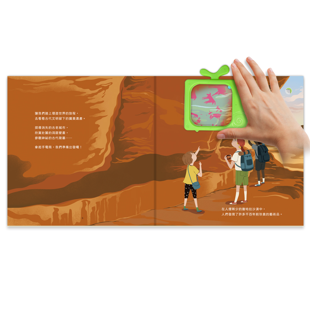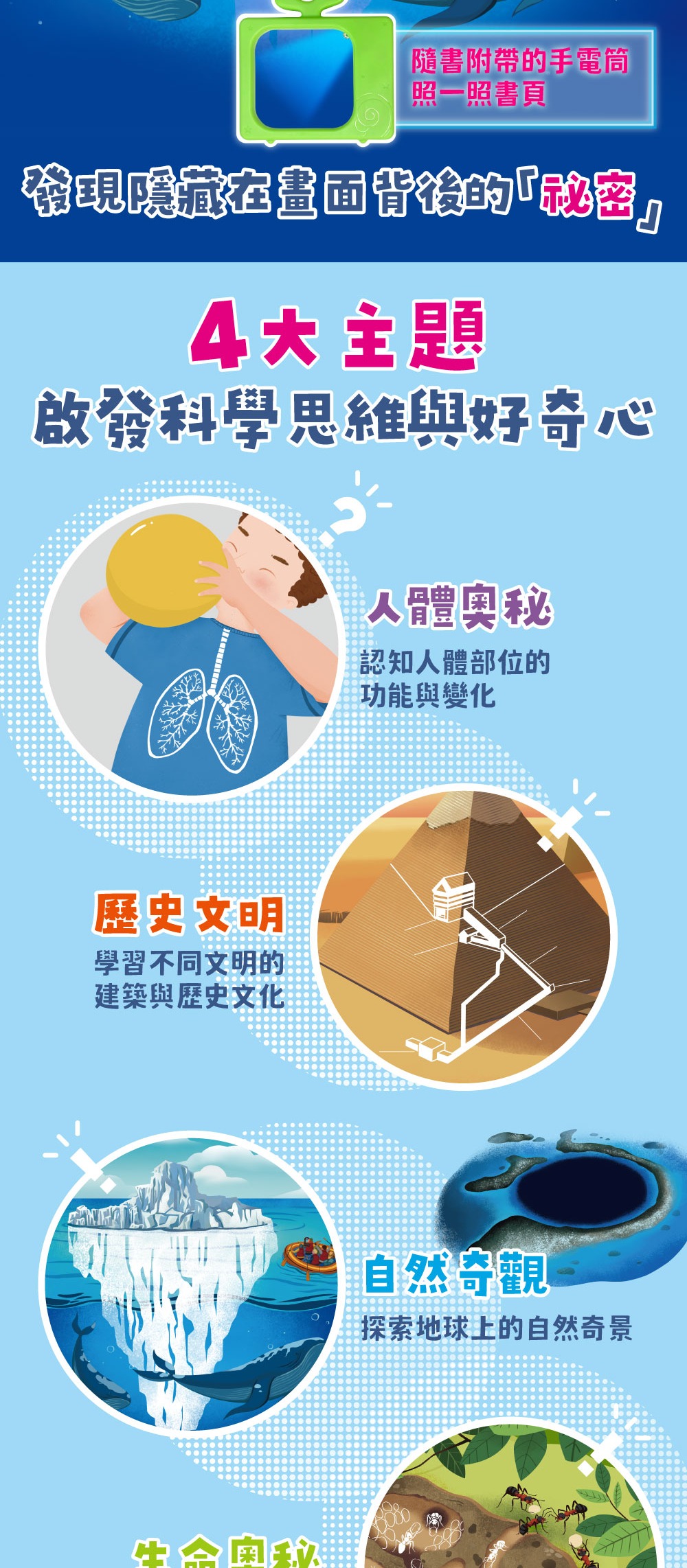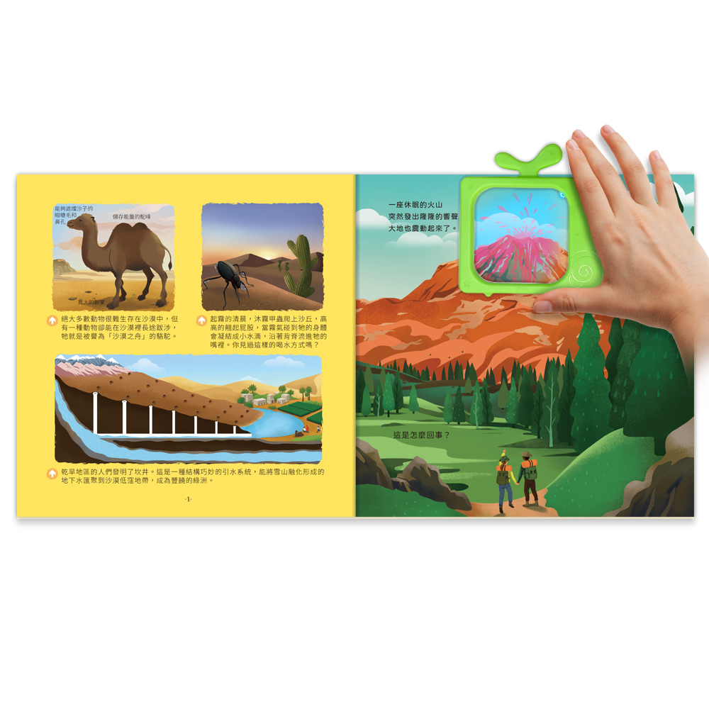 隨書附贈專用「隱形手電筒」,照射頁面即可顯示隱藏畫面,讓孩子化身自然偵探,探索沙漠、海洋、溶洞裡的神奇世界。