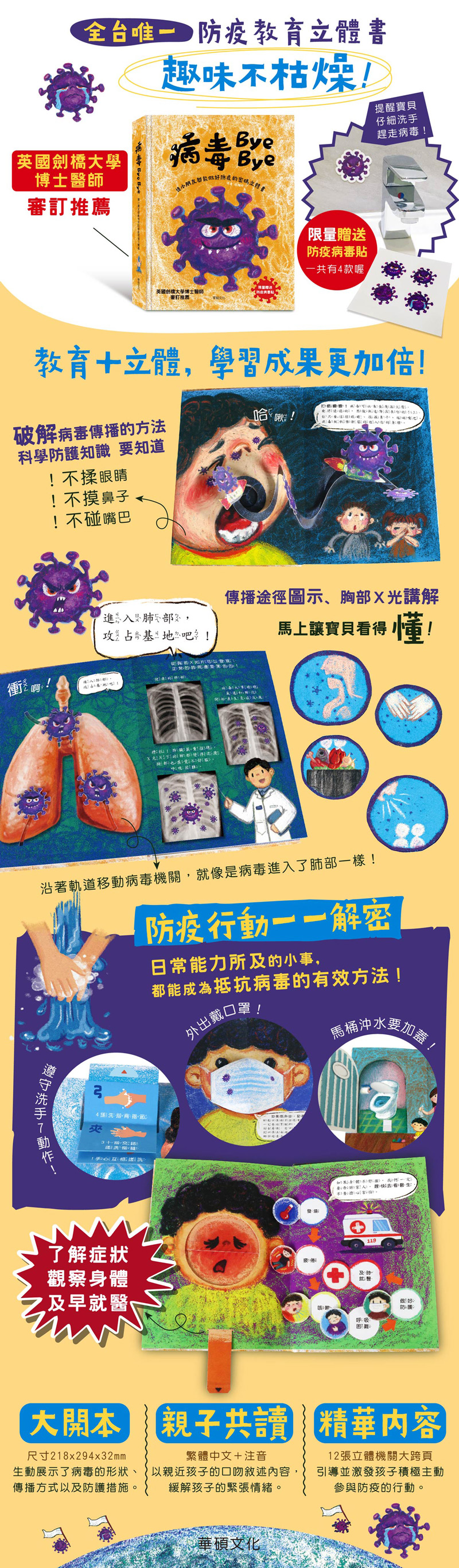 - 全台唯一防疫教育立體書,大開本設計,生動展示了病毒的形狀、傳播方式以及防護措施,趣味不枯燥。