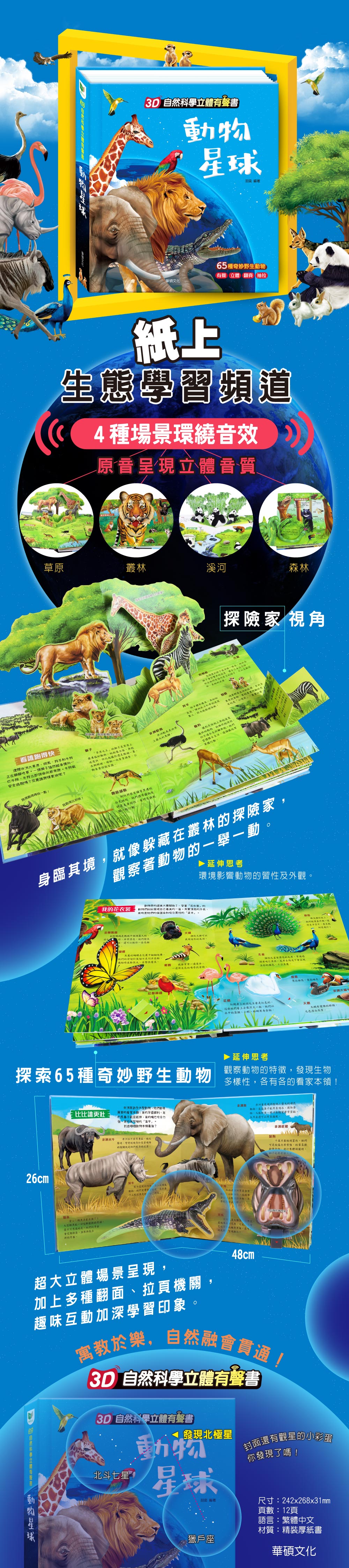 - 紙上生態學習頻道!場景環繞音效,原音呈現,讓你感覺就像躲藏在叢林間的探險家,觀察著動物們的一舉一動。