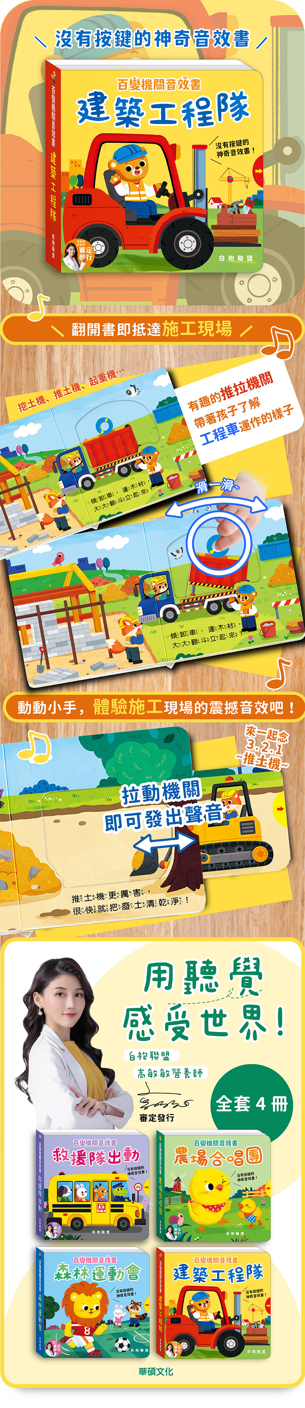 每個頁面內建巧妙機關,拉一拉、推一推,就能聽見逼真的工程車聲音,感受工地的震撼場景!