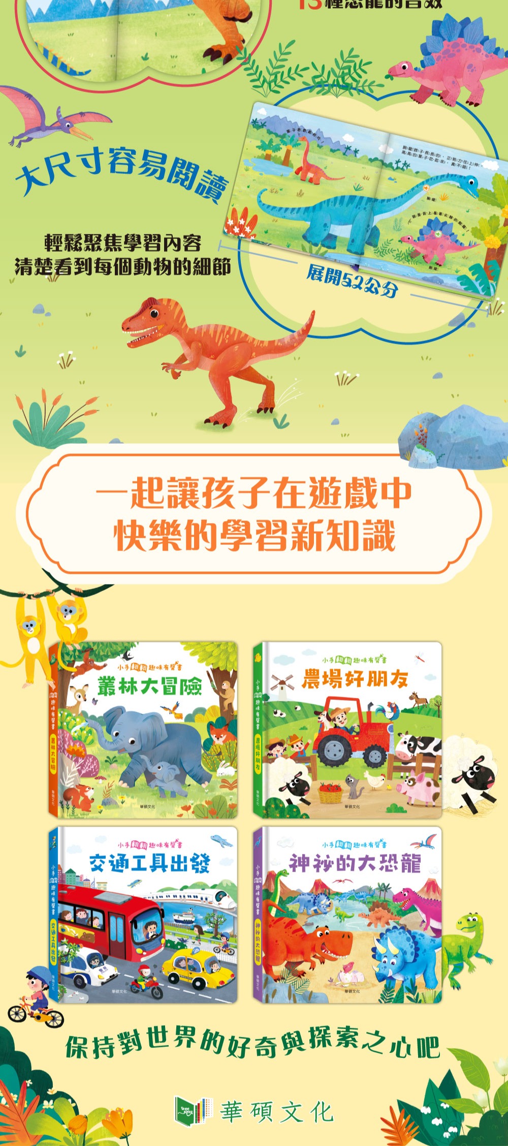 書籍尺寸大,能輕鬆聚焦學習內容,清楚看到每個恐龍的細節,讓認知更加具體。此外,大尺寸頁面還能讓孩子更容易翻閱,提升閱讀的流暢感。