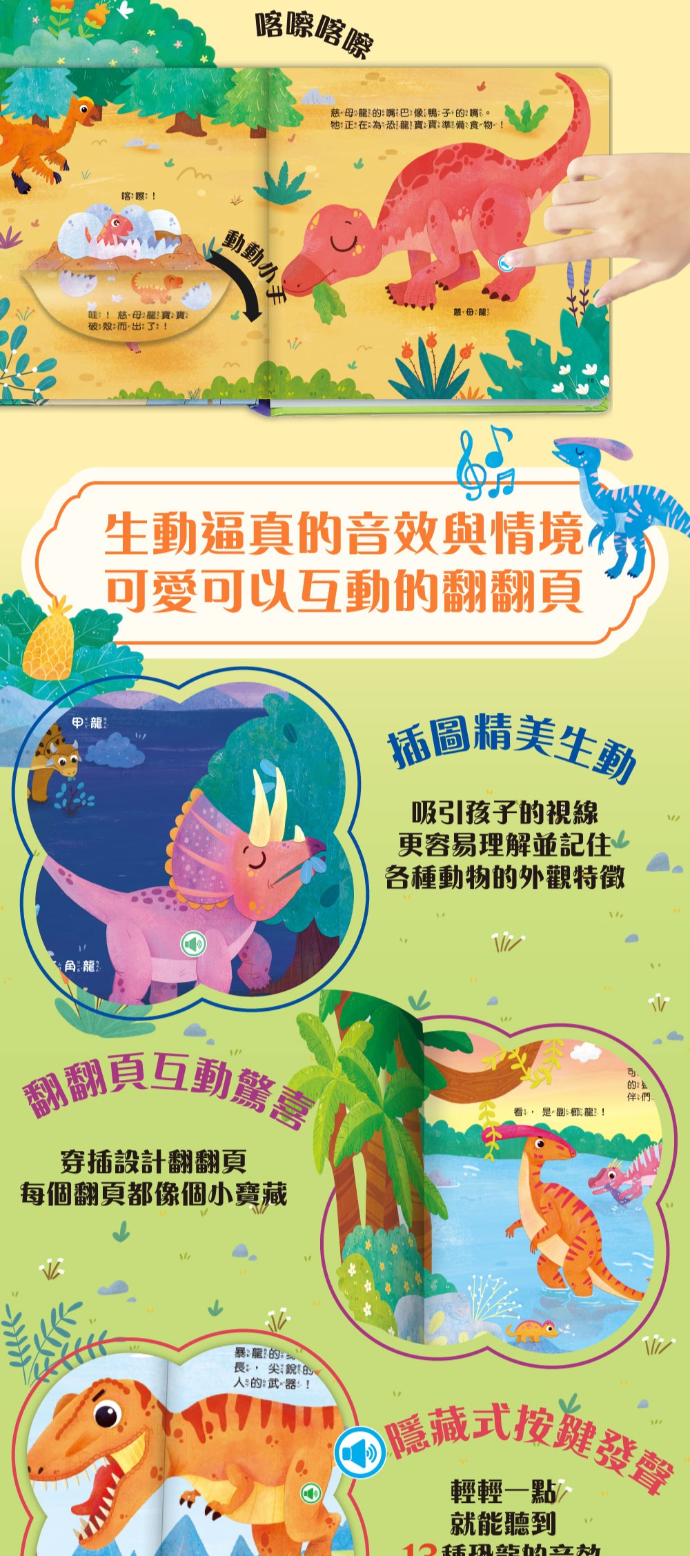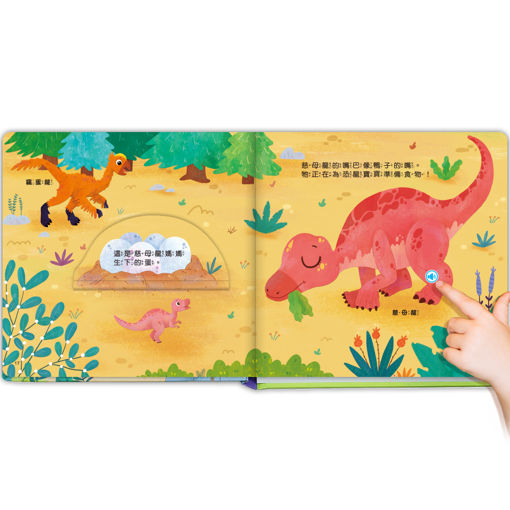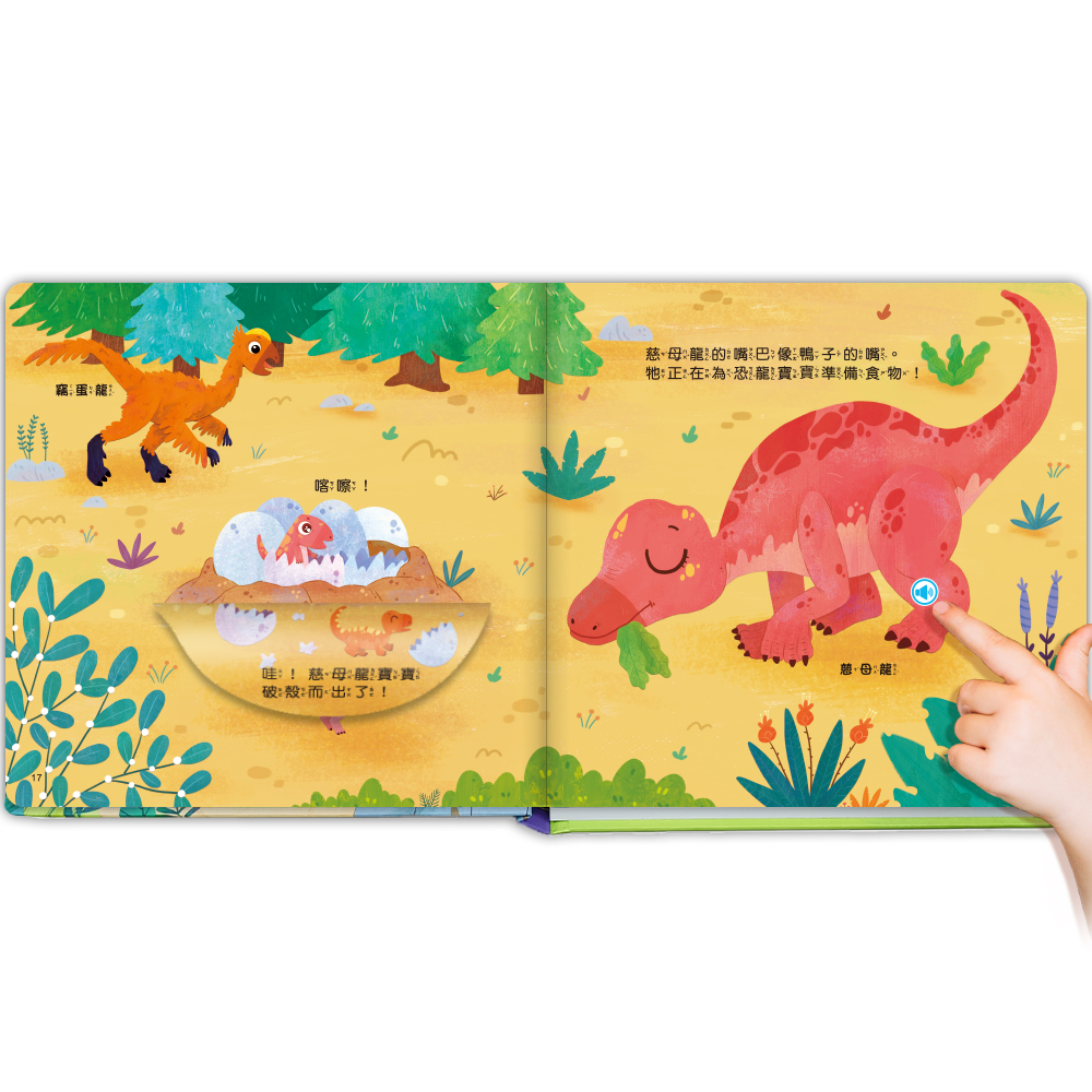 只需輕輕一點,就能聽到13種恐龍的音效,隱藏式按鍵不影響書本美觀,讓閱讀更方便。