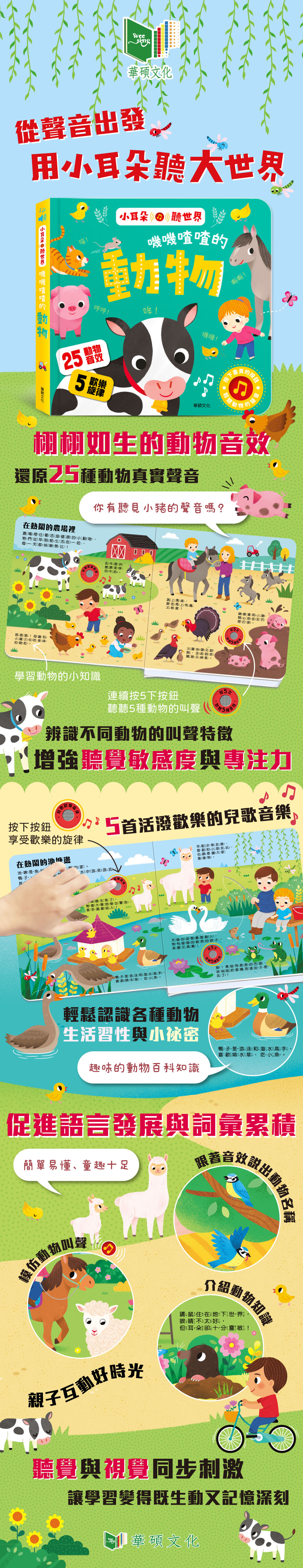 還原25種動物真實聲音,透過反覆聆聽,孩子能逐步辨識不同動物的叫聲特徵,增強聽覺敏感度與專注力,並激發對自然世界的好奇心。