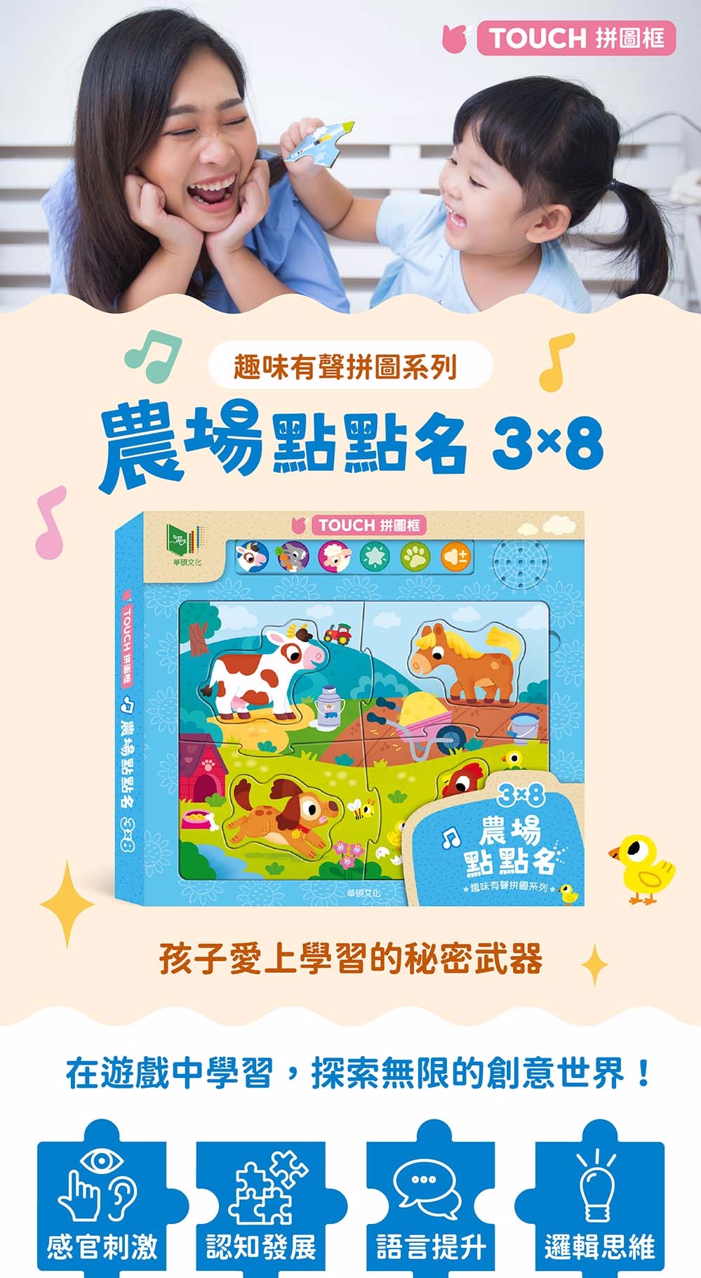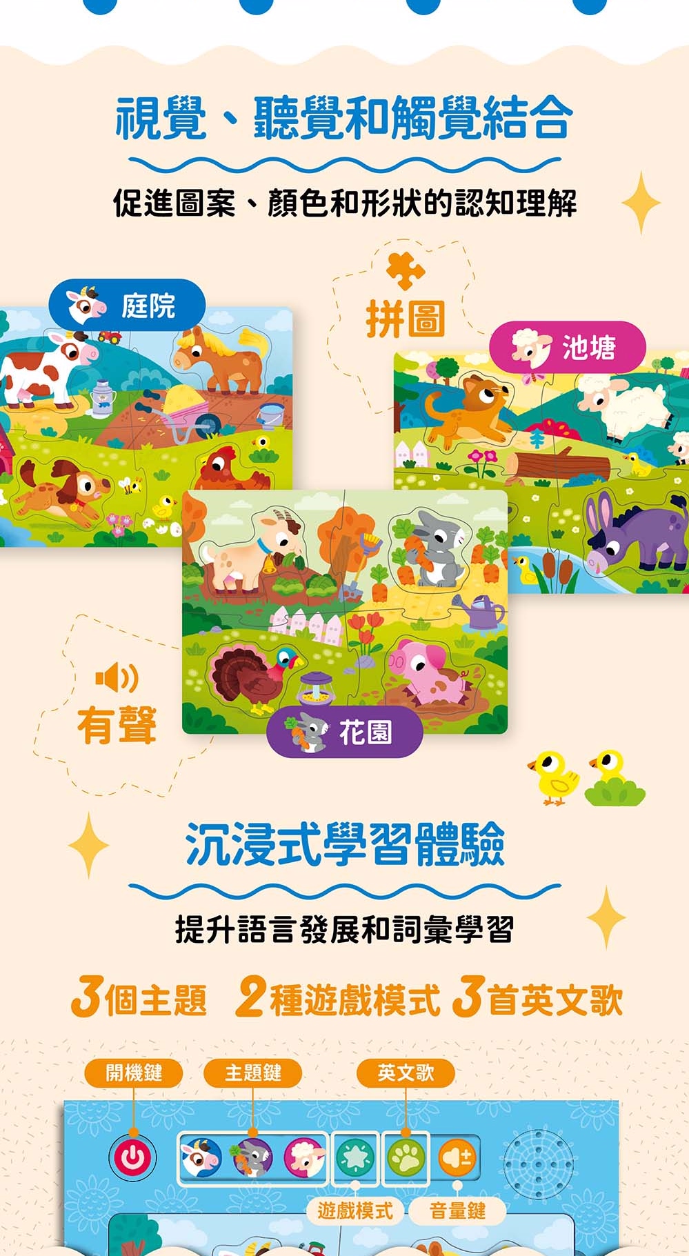 - 按壓拼圖即可聆聽可愛農場動物的聲音!